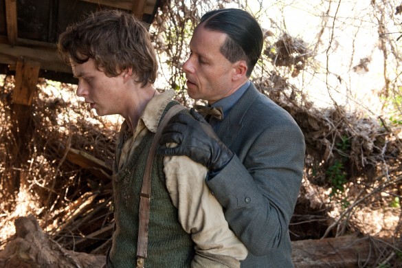That is until Chicago lawman Charlie Rakes (an eyebrow-less Guy Pearce) arrives on the scene to demolish the boys’ American pastoral and false sense of invincibility.  Who kicks a man when he’s down?  Special Deputy Rakes does and viciously so.  The locals murmur that Rakes wears perfume and as he gores Jack across his own backyard, he worries that he’ll bloody his crisp pinstripe suit and swimming cap of pomaded hair.  Jack recovers, tensions mount, and during a first date gone terribly wrong, Bertha happily trades in her head scarf and church-going clothes for the yellow, strawberry-patterned dress Jack has brought her.  All around them, meanwhile, Rakes and his corrupt cronies are bearing down.