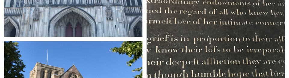 Austen made her will on the 27thof April and within a month, she bid her mother farewell for the final time and, with her beloved sister, set out for Winchester (once the capital of England) and lodged at 8 College Street. The novel Sanditon – soon to be a BBC miniseries – was left unfinished. You can see the yellow house below, close to the college, and the plaque outside this now privately owned home. It’s eerie and fortuitous to write this final post on the day in which Austen was laid to rest inside Winchester Cathedral, one of the largest cathedrals in the world (constructed in 1079, consecrated 14 years later. “Winchester Cathedral, you’re bringing me down.” You can Spotify the Frank Sinatra version of that classic by the New Vaudeville Band in 1966. Not far from the famous cathedral, Benjamin Franklin composed some of his Autobiography and, in earlier times, the sardonic versifier Alexander Pope was expelled from school. That’s the west door to the cathedral in the top left below.